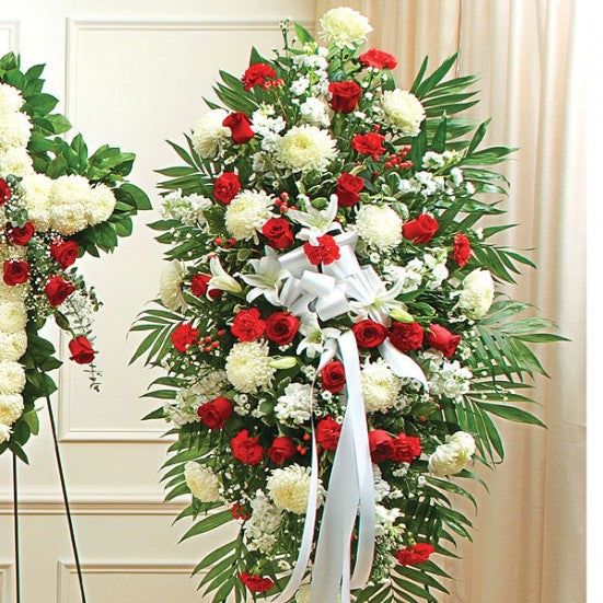 With red flowers that symbolize love and white flowers that symbolize reverence, this beautifully crafted standing spray conveys all the love and sympathy you feel deep in your heart. Our expert florists use only the freshest blooms for an arrangement that reflects your compassion and support. Sympathy and funeral flower arrangements and plants from Bloom Funeral Flowers.
